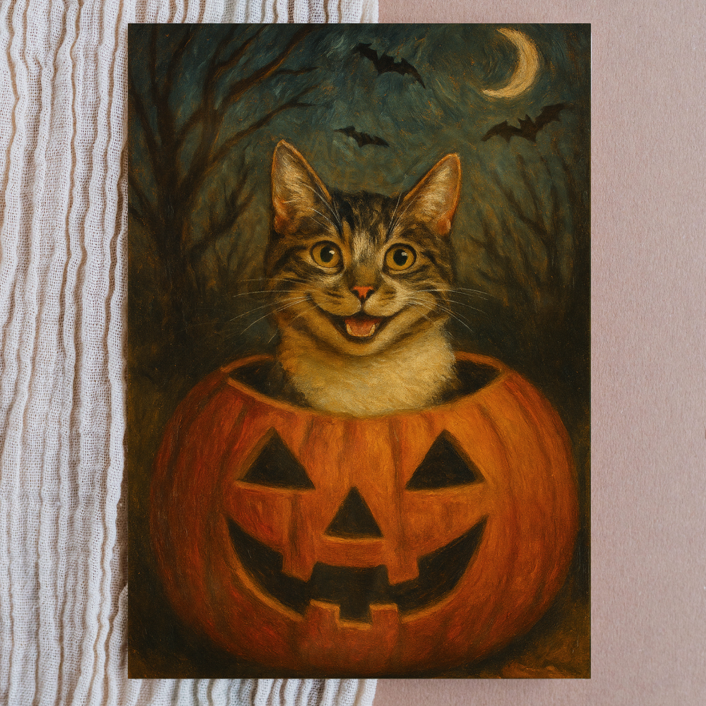 Get your furry friend ready for spooky season with our Happy Halloween collection. Each personalized portrait transforms your cat or dog into the star of a festive Halloween scene—complete with glowing jack-o’-lanterns, full moons, and playful autumn vibes. Every artwork is custom-made to feature your pet, blending the magic of Halloween with their unique personality.